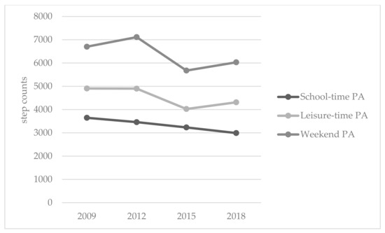 Mean step counts during school-time, leisure-time and weekends among Greek preschool children between 2009 and 2018.
