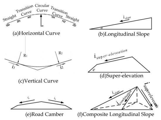 Road geometric parameters. (a) horizontal curve; (b) longitudinal slope; (c) vertical curve; (d) super-elevation; (e) road camber; (f) composite longitudinal slope.