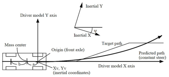 The calculation of the controller uses a special coordinate axis system, as shown in Figure 3. In the coordinate axis, the center of the vehicle front axle is x = 0, y = 0. The yaw of a vehicle is defined as ψ = 0. The X and Y axis are aligned with the longitudinal and lateral axes of the vehicle. In the coordinate axis of the driver’s controller, the motion of the vehicle is predicted based on these axes. The axis is fixed in the inertial reference and rotated ψ based on the inertial axis.