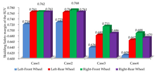 The skidding indices of the SUV under four road segments are obtained through CarSim simulation. The skidding safety margins of four wheels are shown in Figure 5.