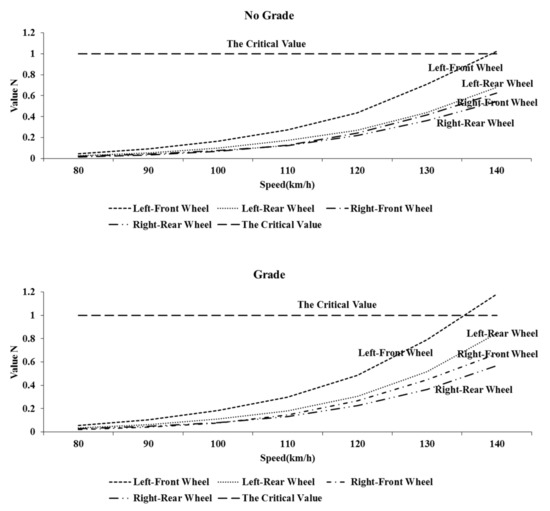As shown in Figure 6, the critical skidding condition of the SUV is achieved by increasing speed of the SUV with or without grade (case 4, in Table 4). The speed of the SUV was increased from 80 km/h, at intervals of 10 km/h, until a certain wheel was about to slide, which is at N≥1. It can be seen from Figure 6 that the value N of the left-front wheel (front-inner wheel) is the largest regardless of grade. When the vehicle speed was 140 km/h, the N values of the left-front wheel (front-inner wheel) reached critical condition. That is, when the vehicle was skidding, whether there was a grade or not, the left-front wheel (front inner wheel) was subject to skid first. The conclusion is consistent with that of Mavromatis obtained through calculating horsepower utilization factor [32]. In addition, it was found that in the curve with the grade, the speed of vehicle reaching critical skidding was lower, that is, the vehicle was easier to skid. Therefore, the left-front wheel (front-inner wheel) of the SUV was defined as the most critical wheel (wheel with priority to skid) when turning. The following studies were focused on the left-front wheel (front-inner wheel) of the SUV. The front wheel shows importance due to the front wheel drive configuration of the SUV. The internal wheel is due to the higher friction of the inner wheel caused by the lateral load transfer of the SUV negotiating on the curve. Although the skidding is not certain to occur when the condition of skidding is reached, it means that the vehicle is transiting to unstable lateral motion.