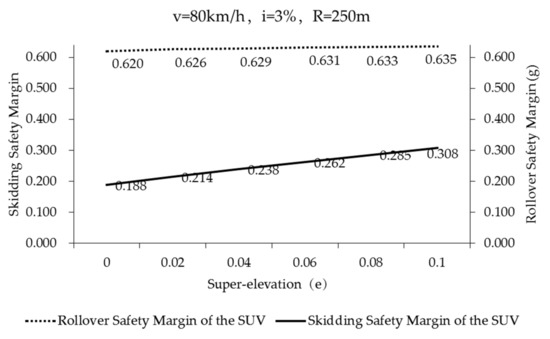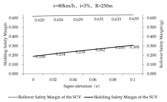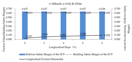 The black solid line in Figure 8 represents the safety margin of rollover of the SUV during curve negotiation (Case 1–6 in Table 5) (fTmax = 0.85). It can be found that the super-elevation has little effect on the rollover safety margin of the SUV, so that it can be neglected. According to the literature [45], the lateral friction demand is a part of the lateral acceleration of the vehicle that will not be offset by the super-elevation. The scales of principal ordinate and secondary ordinate are the same in Figure 8. Through comparing the skidding safety margin (blue strip, principal ordinate) with the rollover safety margin (black solid line, secondary ordinate) of the SUV, it can be seen that both are very large. Therefore, if the SUV is passing through roads (fTmax = 0.85) of the most unfavorable road geometry combination at the speed specified in the standard, both skidding and rollover will not occur easily (especially rollover). When comparing the safety margin of rollover and safety margin of skidding by CarSim model in Figure 8, the safety margin of rollover is always higher than that of skidding. Comparing the rollover safety margin and skidding safety margin by the point mass model; when the super-elevation is at e < 0.06, the safety margin of rollover is always higher than that of skidding. When the super-elevation is at e ≥ 0.06, the rollover safety margin is slightly smaller than the skidding safety margin.