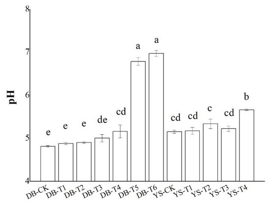 Effect of soil amendments on pH values in DB and YS soils. Means of significant difference are statistically analyzed by t test or Tukey’s multiple range tests at p < 0.05. The different lowercase letters in the figure indicate the significant difference in the soil pH values at different treatments.