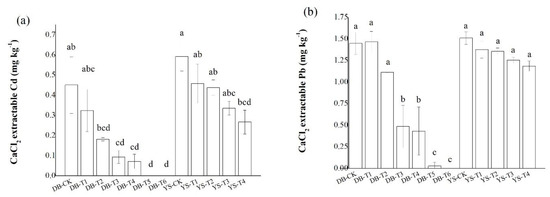Concentrations of CaCl2-extractable Cd/Pb in the DB-T6 soil were undetectable, significantly lower than those of the DB-CK (Figure 2). In YS-T4 soil, the CaCl2-extractable Cd and Pb concentrations were decreased by 54.9% and 21.5%, respectively, compared with those in YS-CK. Application of CB and OF among the two soils showed that the former had a greater reduction in CaCl2-extractable Pb content in soil than the latter. The changes in Cd and Pb availability in soil after applying the amendments might be related to the following factors. First, related studies (e.g., [25]) have shown that the adsorption of Pb2+ by CB depended on its CEC and ash content. The ash enhanced the electrostatic adsorption of the negative charge on the surface of the CB and increased the adsorption of Pb2+. In addition, a high CEC indicated a large surface charge number of the CB, which corresponded to a strong electrostatic adsorption capacity for metal cations. Second, the addition of OF should adjust the pH value of the soil, and the functional groups in the organic matter have a high affinity for Cd [29,30]. Other studies have found that high temperature can affect the biochar’s porosity development, and its pore parameters, like CEC, can significantly affect the chemical surface adsorption of biochar on heavy metals [31]. Soil pH is considered to be a key factor in determining Pb availability [32]. Moreover, metal cations mainly reduced their availability in soil by adsorption or formation of metal hydroxide precipitates when pH > 7.0 [33]. Third, the various elements in IS made it capable of precipitating or co-precipitating many metal ions, and such a system had a specific chemisorption potential for various metal ions [34]. The decrease in soil available Cd and Pb contents by applying IS might be caused by the increase in soil pH and available silicon content [34]. Our previous studies have shown that application of IS not only enhances the adsorption of heavy metals on its surface, but also precipitates heavy metals with Si, thereby reducing the bioavailability of heavy metals [27,35].