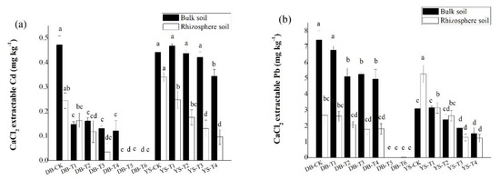Concentrations of CaCl2-extractable (a) Cd and (b) Pb of bulk and rhizosphere soils in DB and YS. Means of significant difference are statistically analyzed by t test or Tukey’s multiple range tests at p < 0.05. The different lowercase letters in the figure indicate the significant difference between the rhizosphere soil CaCl2-extractable Cd and Pb at different treatments, and the different uppercase letters indicate significant differences between treatments under the bulk soil CaCl2-extractable Cd and Pb.