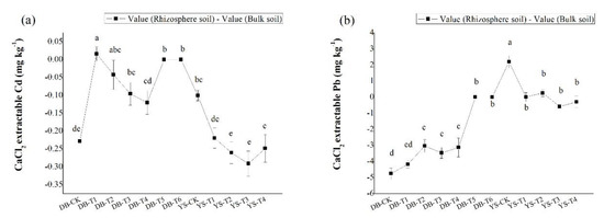 Compared with the control, the CaCl2-extractable Cd/Pb concentrations in bulk soil showed a significant decrease with the application dosage of amendments (Figure 4), consistent with the trend in the soil simulation experiment (Figure 2). Under the DB control treatment, the concentrations of CaCl2-extractable Cd/Pb in the rhizosphere soil were 48.3% and 64.2% lower than those in the bulk soil, respectively, which could be ascribed to the plant effect. The available Cd/Pb can be absorbed onto root surface and assimilated into roots, thereby reducing the bioavailabities of Cd/Pb in the soil [52]. After applying the soil amendment, the concentrations of CaCl2-extractable Cd (DB-T4) and CaCl2-extractable Pb (DB-T1 to DB-T4) in the rhizosphere were still lower than in the bulk soil (Figure 5), but their differences were less than those of the control (Figure 5), indicating that the decrease of the bioavailable Cd (DB-T4) and bioavailable Pb (DB-T1 to DB-T4) results from the combination effect of root absorption and immobilization by soil amendments. After the application of the alkaline soil amendment IS (DB-T5 and DB-T6), the concentration of CaCl2-extractable Cd/Pb in the rhizosphere was close to zero, which had no difference with the bulk soils. This is due to the strong immobilization of IS application, as shown in the simulation experiment (Figure 2). In YS control soil, the CaCl2-extractable Cd concentration in the bulk soil was significantly higher than that of rhizosphere soil (Figure 5). The CaCl2-extractable Cd gradually decreased when the soil amendments were applied (Figure 4), but the differences between bulk soil and rhizosphere soil gradually increased (YS-T1 to YS-T3) (Figure 5). It is speculated that the addition of organic fertilizer may enhance the absorption capacity of plant roots [53]. The concentrations of CaCl2-extractable Pb in the rhizosphere soil of control (YS-CK) was much higher than that in bulk soil (Figure 4 and Figure 5), indicating that the rhizosphere exudates may have activated the heavy metals such as Pb [54,55,56,57,58]. The difference in the concentrations of Pb between rhizosphere and bulk soil was not significant at YS-T1 to YS-T4 (Figure 5), which suggests that soil amendments (CB and OF) contribute more to the immobilization of Pb in soil than plant absorption of this metal.