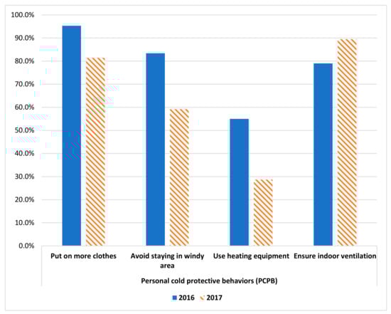 In general, warm-keeping PCPB uptake rate was statistically significantly higher during the colder cold wave in 2016 (p < 0.0005 in chi-square test) (Figure 1). During the colder cold wave in 2016, 95.3% had reported putting on more clothes, 83.4% had avoid staying in windy area and 55.0% has used heating equipment during the cold wave (80.2 % among those owning heating equipment). In the milder cold wave in 2017, 81.4% had reported putting on more clothes, 59.2% had avoided staying in windy area and 28.7% had used heating equipment (41.0 % among those owning heating equipment). In contrast, the proportion of subjects that had ensured indoor ventilation increased from 79.0% in 2016 to 89.5% in 2017.