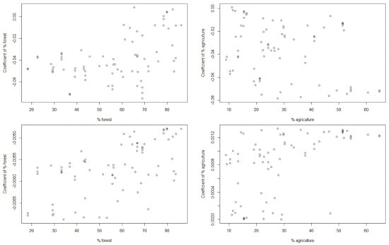 | Coefficient of % forest (BOD) | low | −0.475 | 0.010 | −4.211 | 0.000 ** |