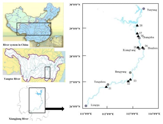 Location of sampling sites in the Xiangjiang River, China.