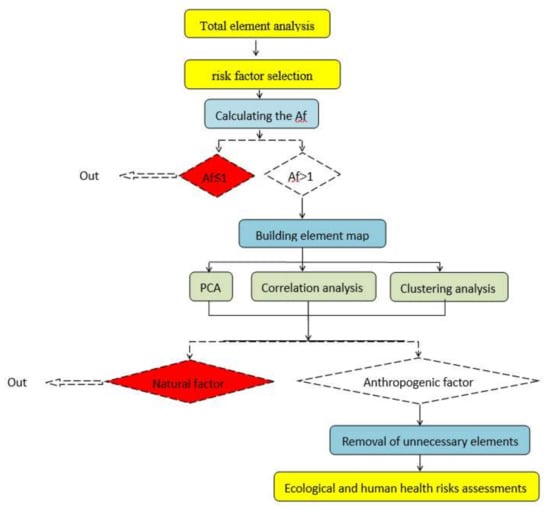 Although the elements are screened for the health risk assessments in the previous studies, their core principles are empirical [,,,,,,,]. The five toxic heavy metals (Hg, Cd, As, Pb, Cr) or other characteristic metals (Ag, Cu, Zn, Co, Mn, V, Ni, Se and Cs, etc.) were considered as the objects for regional health risk assessments [,,,,,,,,,,,]. To our knowledge, there is no hierarchical screening method for preliminary screening in the risk assessment processes.