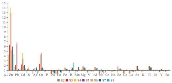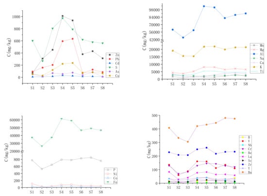 In the present study, the chalcophile elements of Pb, Zn, Cd, As and Cu were abnormally rich in the midstream of the Xiangjiang River. The metals were likely discharged from adjoining mining operations, smelting plants and residences [,,]. The lithophile elements were accumulated in sediment and combined with the diverse metal organic complex or iron oxide forms [,]. Meanwhile, other elements (e.g., Mg, Ca and Al) were leached from rocks and soil in a humid climate and fluvial environment. This was similar to other research, such as in the basalts and basanites of the French Massif Central [].
