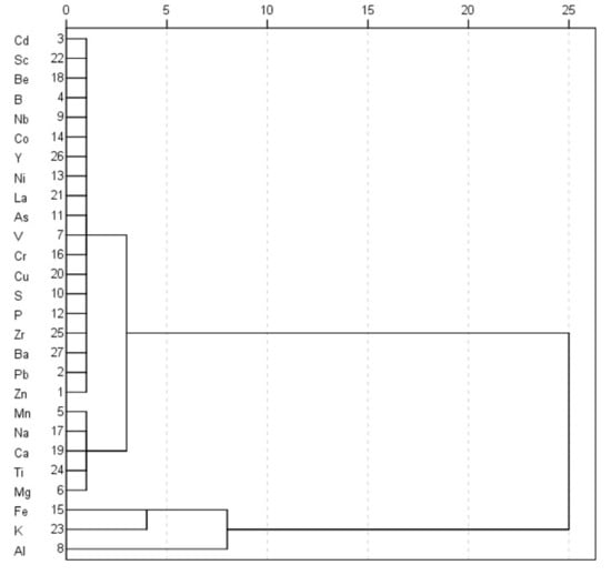 Correlation analyses were performed to determine the relationships between elements. The PCA of the annual mean of elements with the varimax rotation of the standardized component loadings was conducted by the eigenvalue decomposition. The Kaiser–Meyer–Olkin (KMO) and Bartlett’s tests were performed to evaluate the validity of the PCA, and the principal component value > 1 was retained until the cumulative variance was > 80%. Standardized data sets were subjected to cluster analysis using the Minkowski and Ward method [,], and depicting relationships among elements with a dendrogram. Pearson correlation was also used to explore relationships among the elements.