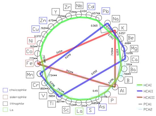 There were complicated relationships among elements in the sediment samples due to uncertainties factors [,]. An element map (Figure 6) was built according to the periodic table, principal component analysis, cluster analysis and correlation indices, which can help sort out the relationships between the elements. In the element map, all elements were arranged in a circle according to the periodic table. The two lines represented the results of principal component analysis and cluster analysis, respectively, and the number between the lines represented the correlation coefficient of the two elements. As shown in Figure 6, the elements of Zn, Pb, Cu, Cd, Y, Zr and Nb had significantly positive correlation with each other (p < 0.01). In addition, there was no significantly negative correlation with other elements. Correlation analysis and Af values suggested that Y, Zr and Nb were derived from soil erosion in the upper reaches of the river, while Zn, Pb, Cu and Cd originated from the anthropogenic activities to discharge the combined industry pollutants with highly complex human-induced and environmental processes in the Xiangjiang River [,]. A positive correlation (p < 0.05) was presented between the same principal component elements, except the pairs of Ni and Cu, Nb and Cd, P and As and Be and Ba. The pairs of Ni and Cu, Nb and Cd and P and As, belonged to a different geochemical element classification (Figure 6). Through the PCA, the pair of Be and Ba did not belong to the same principal component, and Be possibly derived from the anthropogenic sources, whereas Ba from the biogenic carbonates.