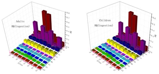 The results of the hazard quotient (HQ) and chronic hazard index (HI) for the sediment samples of the Xiangjiang River are summarized in Figure 7 with corresponding ingestion, dermal and inhalation reference dose (RfD). The calculated HQ values for the selected elements ranged from 3.59 × 10–5 to 7.1 × 10–1. The HI values for both children and adults followed the order: Pb > As > Cr > V > Zn > Mn > Cu > Cd > Be > Co. Pb showed a higher noncarcinogenic risk than other elements because of its high concentration and low RfD values []. Especially, Cd had a high ecological risk values (Chai et al., 2017), but a low noncarcinogenic risk values, due to its low concentration in the sediment samples or a lower background value. For the Xiangjiang River, the average HI values for adults were higher than for children due to a large dermal contact area. Pb at stations S4 and S5 posed potential noncarcinogenic risk for children and adults, although the HI values of other metals were lower than 1. In conclusion, the noncarcinogenic risk of the chalcophile elements and some of the lithophile elements (V, Mn and Be) were significantly higher than the siderophile elements.