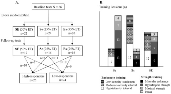 Study design (A) and the strength and endurance training plan of the groups (B). Se = strength emphasized training group; Es = endurance emphasized training group; SE = evenly balanced strength and endurance training group; and ET = endurance training.
