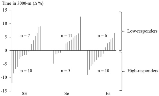 Out of the 66 soldiers who initially took part in the study, the data were analyzed for those who participated in the 3000-m running test at the beginning and at the end of the operation (n = 49). The combined data of these soldiers were re-grouped to high responders (HiR, n = 25) and low responders (LoR, n = 24), according to the changes in endurance performance assessed by the 3000-m running test (Figure 2). The HiR group consisted of soldiers who decreased their 3000-m test time, while the soldiers in the LoR group either maintained or increased their running test time during the operation. Descriptive statistics (mean ± SD) were reported when appropriate. The relative changes were calculated on the basis of individual values. The significances of group differences were tested by using the Mann–Whitney test. In addition, the relationships between relative changes of the measured variables were tested with Spearman’s rank correlation coefficient using all available data. IBM SPSS Statistics version 25 (Chicago, IL, USA) was used for all statistical analyses. The p < 0.05 was used to establish statistical significance.