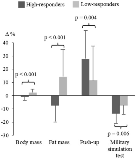 Significant differences in the relative changes of the measured body composition and physical fitness variables during the operation, favoring the HiR group (Figure 4), included BM (−1.0 ± 2.5% vs. 2.3 ± 2.8%, p < 0.001), FATM (−7.6 ± 11.7% vs. 14.2 ± 20.4%, p < 0.001), 1-min push-up (27.7 ± 21.9% vs. 11.7 ± 26.1%, p = 0.004), and MST (−13.6 ± 6.8% vs. −7.5 ± 6.5%, p = 0.006). In addition, interview-based training frequency revealed a relative decrease in endurance training (−40%) in the LoR group, while the HiR group increased their endurance training by 28% (group comparison, p < 0.001). The comparison of the training as well as relative changes in all available variables between the HiR and LoR groups is presented in Table 2.