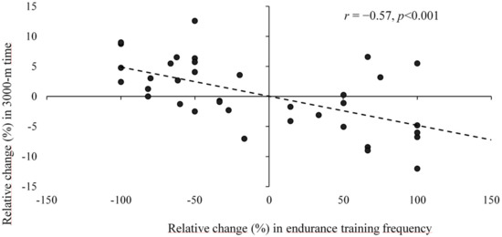Relative increase in weekly endurance training frequency during the deployment vs. pre-deployment, plotted against relative reduction in 3000-m time (r = −0.57, p < 0.001).