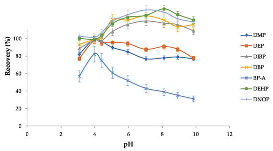 Effect of the pH on the recoveries of PAEs/BP-A investigated in this study. The conditions were as follows: each PAE/BP-A at 50 ng mL−1, 150 μL of toluene, 10 g L−1 of NaCl, and 6 min of ultrasounds.