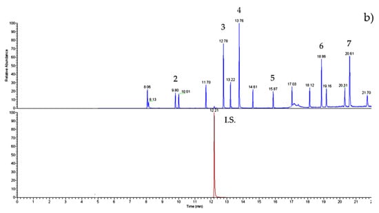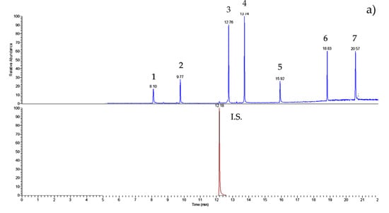 GC–IT/MS chromatograms of (a) PAE/BP-A (50 ng mL−1 of each) standard solution and (b) nectar honey sample (#27). For experimental conditions, see text. Peak list: 1—DMP; 2—DEP; internal standard (I.S.)—phenanthrene; 3—DiBP; 4—DBP; 5—BP-A; 6—DEHP; 7—DnOP.