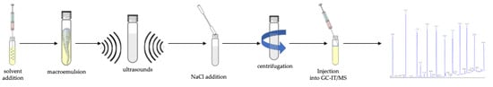 The study of this analytical approach (i.e., the ultrasound-vortex-assisted dispersive liquid–liquid microextraction (UVA-DLLME) procedure) can be divided into several phases. The choice of the best extraction solvent among different solvents, such as n-hexane (density 0.66 g cm−3), n-heptane (0.68 g cm−3), iso-octane (0.69 g cm−3), and toluene (0.867 g cm−3), is the first step. All the solvents tested had a lower density than water. Taking into account the absence of the dispersive solvent, it was necessary to use other methods to achieve efficient emulsification. Among the different possibilities, ultrasound-vortex-assisted was tested: 5 min of vortex and 6 min in the ultrasonic bath (100 W power) allowed us to create a stable and homogeneous emulsion. Second, 10 g L−1 of NaCl addition was necessary to break the emulsion.