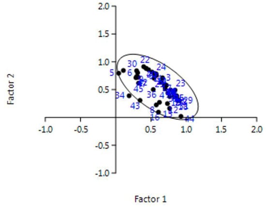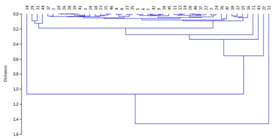 For a deeper knowledge about the correlations among the different samples, a chemometric approach was tested based on the Hierarchical Cluster Analysis (HAC) and the Principal Component Analysis (PCA) for evidencing eventual similarities. The method was applied to overall the data by the use of the Tanagra open-source software [], by means of the centroid merge method and the Euclidean distance as a proximity measure [,,]. First, the HAC evidenced the presence of four different clusters: two formed by one sample (cluster 1 by sample #32 and cluster 2 by sample #34), one by two samples (cluster 3 by samples #27 and #43), and the fourth by 43 samples (i.e., 91.5% of overall samples). Figure 4 shows the dendrogram and the relative similarities among samples.