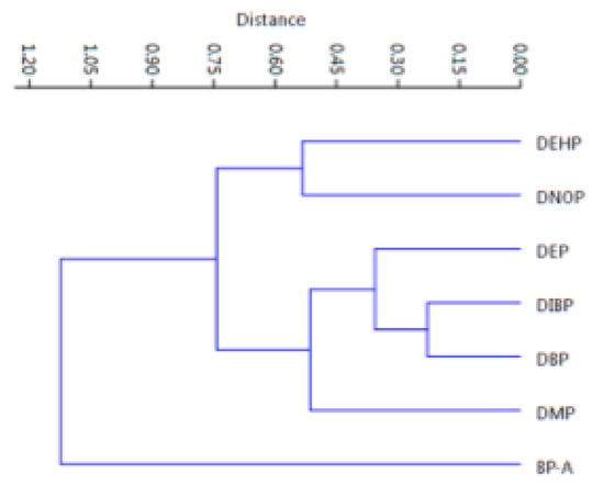 Hierarchical Cluster Analysis for evidencing the correlations among the six PAEs and the BP-A.