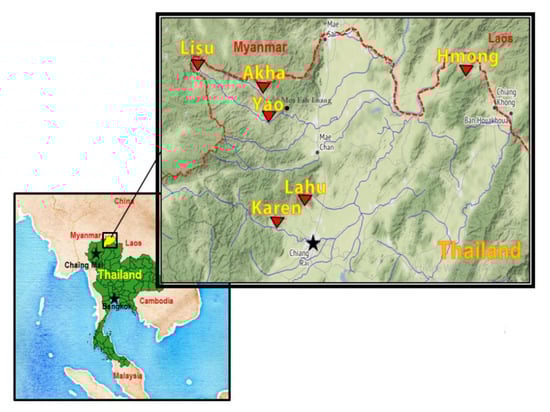 - The Hill Tribe Welfare and Development Center, Chiang Rai Province. Hill Tribe Population 2013; The Hill Tribe Welfare and Development Center, Ministry of Interior: Chiang Rai, Thailand, 2013; pp. 14–27. (In Thai) [Google Scholar]