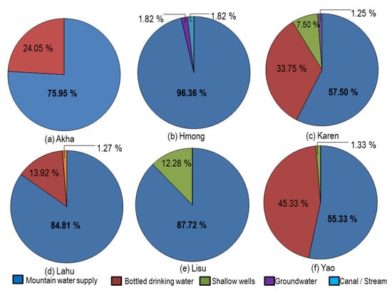 Most of the participants (six hill tribes) obtained their drinking water from a mountain water supply (74.95%), followed by commercial bottled drinking water (21.05%), shallow wells (3.29%), groundwater (0.47%), canal water (0.24%) and other sources (0.24%) such as rain water, spring, and small ponds. In summary, the sources of drinking water of each hill tribe group are shown in Figure 2. The Akha and Lahu people used two sources of drinking water, with more mountain water supply being used than commercial bottled drinking water. For the Hmong people, three sources of drinking water were used: a mountain water supply and two other sources: groundwater and canal. The Karen people consumed drinking water from four sources: mountain water supply, commercial bottled drinking water, shallow wells, and groundwater. The Lisu people used two sources of drinking water: mountain water supply and shallow wells. Meanwhile, the Yao people used three sources of drinking water: mountain water supply, commercial bottled drinking water, and shallow wells.