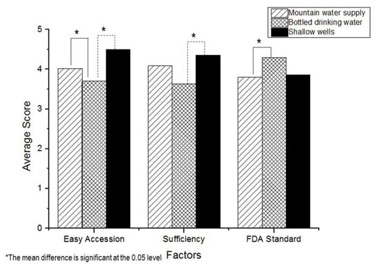It was found that in the criteria of “easy access”, those who used the mountain water supply, and shallow wells were significantly greater than those bottled drinking waters (p-value < 0.05). Considering “sufficiency the whole year”, the mean score of those who used shallow wells was significantly greater than those used commercial bottled drinking water (p-value < 0.05). In addition, for the “FDA standard” criteria, the mean score of those who used commercial bottled drinking water was significantly greater than those who used the mountain piped water supply (p-value < 0.05) (Table 3).