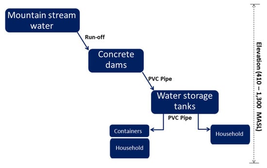 The mountain water supply management of the six hill tribes is summarized in Table 4 and Figure 4. Mountain stream water is obtained from 1–7 raw water source points, depending on the topography of the village location of each tribe. The concrete dams, soil dams and water storage concrete-tanks were used for storing the mountain stream water where were far from their villages, about 1–6 km. The water was supplied through 2–3 inch PVC pipes that distribute the water to storage tanks in their villages. The water was stored in these tanks to allow suspended particles to settle out of the water before further distribution to households using 1½ inch and ½ inch PVC pipes. This mountain water supply system is commonly applied in hilly regions [].