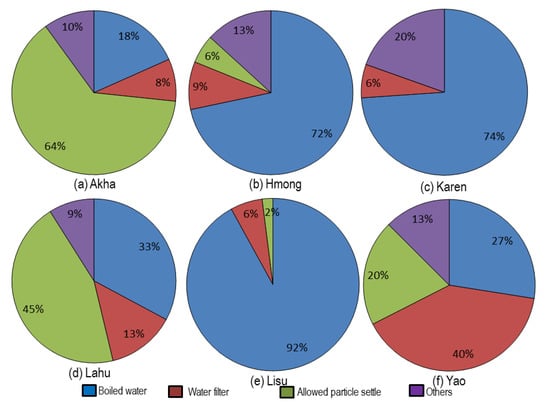 Boiling is the most favorite method for water treatment. This method is an effective method for drinking water treatment at the household level and widely accepted by health professionals, especially in developing countries [,]. The Lisu (92.0%), Karen (74.0%), and Hmong (72.0%) people boiled the water before drinking, respectively. Meanwhile, most of the Akha and Lahu people favored storing the water in containers to allow particle settling before drinking without treatments. These results were similar to the previous reports [,]. This might be due to the belief of some tribes that boiled water is given only to an ill person []. About 40.0% of the Yao people used a water filter for treating their drinking water. A study recommended that to improve the quality of drinking water among the hill tribe people the use of a filter could be effective [].