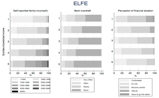 Figure 1, Figure 2, Figure 3 and Figure 4 displays the distribution of the predicted quintiles in terms of the other available cohort-specific SEP-related variables: self-reported monthly net family income at 12 months and geographical deprivation index in Piccolipiù (Figure 1); geographical deprivation index in NINFEA (Figure 2); self-reported income at 2 months, bank overdraft and perception of financial situation in ELFE (Figure 3); and self-reported income at recruitment, bank overdraft and number of hardships in EDEN (Figure 4). In all cohorts, and in particular in the French studies, there was a strong correlation between the self-reported income, as collected by questionnaires, and the EHII. There was a clear association also between the other individual SEP-related variables available in the French cohorts and the EHII: for example, the proportion of those reporting to have experienced a bank overdraft often or several times over the last 12 months in EDEN was 39% among those with the lowest predicted income and about 13% among those in the highest quintile (Figure 4), while the corresponding proportions of those answering no bank overdraft were approximately 30% vs. 65%, with very similar results in the ELFE cohort (Figure 3). Consistent findings were observed when analysing the “perceived financial situation” variable in ELFE and the “number of financial hardships” variable in EDEN. The association between the EHII and the geographical deprivation index, available in the Italian cohorts, was weaker. In Piccolipiù 26% of those predicted to have the lowest income were resident in the least deprived area according to the geographical index compared with 38% among those predicted to have the highest income (Figure 1). The corresponding figures in NINFEA were 20% vs. 30% (Figure 2).