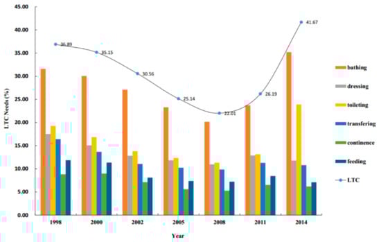 From 1998 to 2014, the overall LTC needs of the elderly decreased first and then increased, among which older people had the highest needs for bathing and toileting, the average proportions of those being 27.29% and 15.80%, respectively. Especially in 2014, the total LTC needs of the elderly were as high as 41.67%. Of the sample, the needs for bathing and toileting among the elderly increased to 35.2% and 23.9%, respectively (Figure 1).
