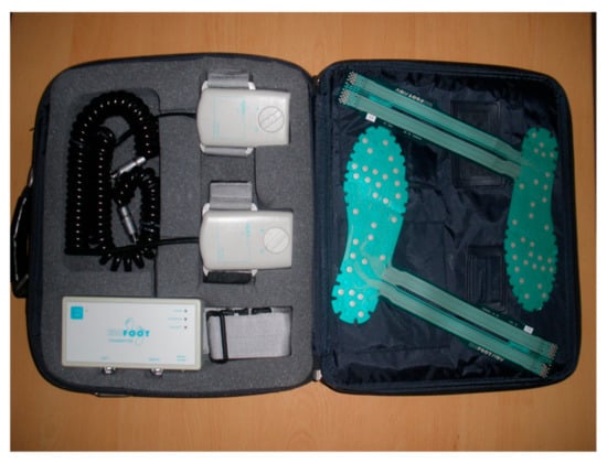 Pedobarometric measurements were made with the Biofoot/IBV® (Instituto de Biomecánica de Valencia, Valencia, Spain) instrumented insole system (Figure 1). It consists of a pair of flexible insoles with 64 piezoelectric sensors (0.5 mm thickness, 5 mm diameter). Data is sent by digital telemetry from the amplifier to be logged on a computer and then processed by software that shows the plantar pressure (kPa), contact time (s), and cadence (steps/minute) parameters. The digital telemetry system has a range of 200 m with sampling rates between 50 and 250 Hz. The system has been shown to be reliable [27].