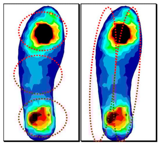 The second greatest MPPs corresponded to the forefoot (Table 1). This may be due to the high load it supports in the propulsion phase of running gait. Once the heel lifts off from the ground, the forefoot bears the entire load of the body, as has been determined by the values measured in other studies [23,33]. Additionally, the rapid transition of support from rearfoot to forefoot during the dynamics of running gives these areas particular biomechanical relevance at the expense of the relevance of the midfoot [21,34].