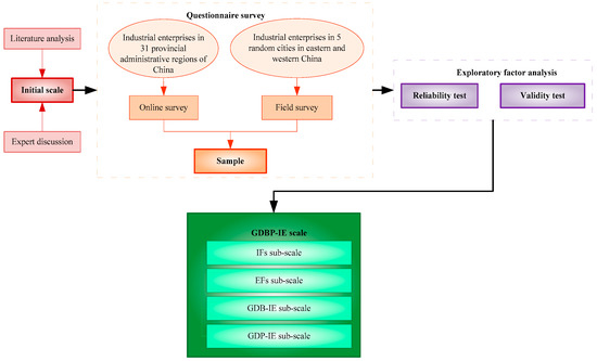 Framework for GDBP-IE scale development. Note: IFs—internal factors; EFs—external factors; GDB-IE—green development behavior of industrial enterprises; GDP-IE—green development performance of industrial enterprises.