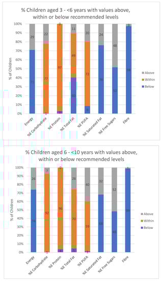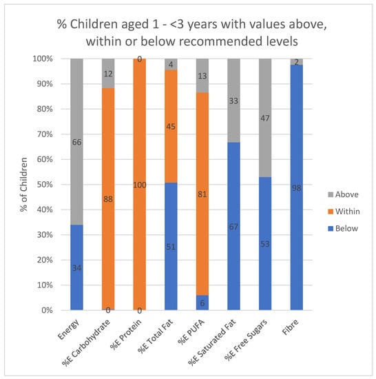 Children aged 1–<3 years; 3–<6 years and 6–<10 years, lying below, within, or above recommended energy and macronutrient intake ranges for their age. EER = Estimated energy requirement (37]: M (1–2 yrs): 4393 kJ; F (1–2 yrs): 4166 kJ; M (3 yrs): 6213 kJ; F (3 yrs): 5837 kJ; (4 yrs): 6552 kJ; F (4 yrs): 6171 kJ; M (5 yrs): 6937 kJ; F (5 yrs): 6514 kJ; M (6 yrs): 7289 kJ; F (6 yrs): 6870 kJ; M (7 yrs): 7699 kJ; F (7 yrs): 7192 kJ; M (8 yrs): 8079 kJ; F (8 yrs): 7573 kJ; M (9 yrs): 8548 kJ; F (9 yrs): 7908 kJ; Acceptable macronutrient distribution range (AMDR): Carbohydrate %E: 45–65%, []; %E from protein in 1–3-year-olds: 5–20%, 4–9-year-olds 10–30% []. Protein RDA 1–3-year-olds 3 g, 4–8-year-olds 19 g, 9-year-olds 34 g []. %E from fat in 1–3-year-olds 30–40%, 4–9-year-olds 25–35% [], saturated fat is <10%E []; Total fibre adequate intake (AI) [] 1–3-year-olds −13 g, 4–9-year-olds 25 g, and free sugars intake <10%E [].
