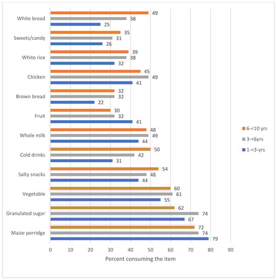 Figure 3 presents the most commonly consumed food items by the three age groups studied. Overall, the main items eaten by all three groups were maize porridge, granulated sugar, a vegetable, salty snacks, whole milk, cold drinks, a fruit, and chicken. However, certain items were more common among certain age groups. In 1–<3-year-old group, maize porridge (79% vs. 74% and 72%) and fruit (41% vs. 30% and 32%) were most commonly consumed. Granulated sugar was most commonly consumed by the 3–<6-year-old group (74% vs. 62% and 67%), and they also commonly consumed vegetables (61% vs. 60% and 55%). The oldest group consumed the most salty snacks (54% vs. 48% and 44%), cold drinks (50% vs. 42% and 31%), white bread (49% vs. 38% and 25%), and candy (35% vs. 31% and 26%).
