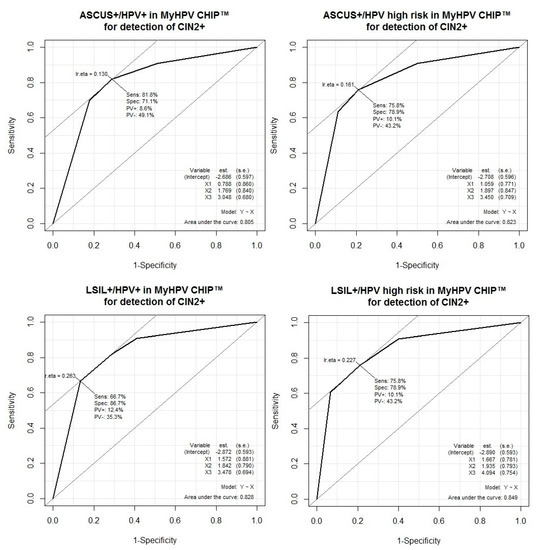 | HPV+ all types (MyHPV CHIP™) and ASCUS+ | 70 (51–84) | 82 (73–89) | 59 (42–74) | 88 (79–94) | 3.92 (2.38–6.45) | 0.37 (0.22–0.62) |