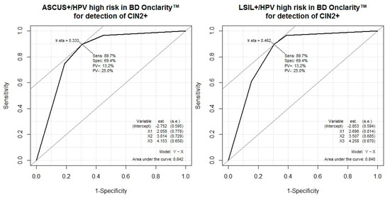 | HPV+, High-risk (BD Onclarity™) and ASCUS+ | 75 (64–83) | 81 (71–89) | 80 (70–88) | 76 (66–84) | 3.97 (2.51–6.28) | 0.31 (0.21–0.45) |