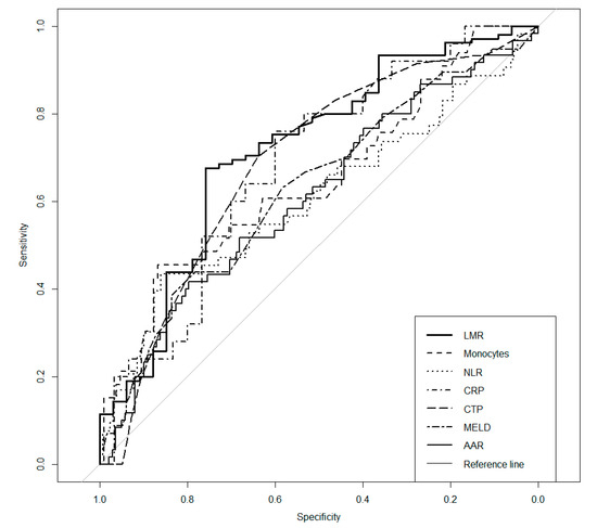- Jamil, Z.; Durrani, A.A. Assessing the outcome of patients with liver cirrhosis during hospital stay: A comparison of lymphocyte/monocyte ratio with MELD and Child-Pugh scores. Turk. J. Gastroenterol. 2018, 29, 308–315. [Google Scholar] [CrossRef]