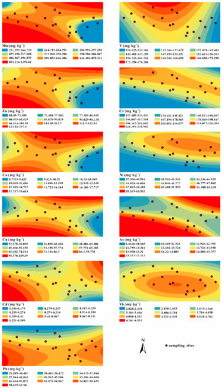 3.2. The Descriptive Statistics and Spatial Distributions of Element Contents