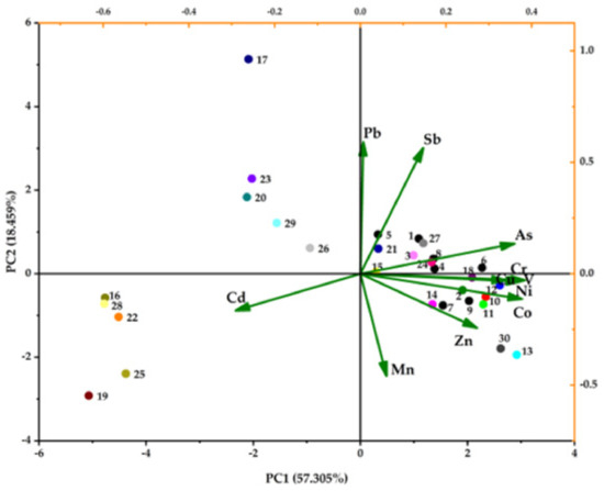 - Borůvka, L.; Vacek, O.; Jehlička, J. Principal component analysis as a tool to indicate the origin of potentially toxic elements in soils. Geoderma 2005, 128, 289–300. [Google Scholar] [CrossRef]