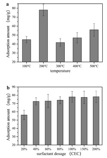 As shown in Figure 1a, in the temperature range of 100 to 200 °C, the adsorption amount of Acid Orange II was enhanced with the increase in temperature, and the adsorption amount at 200 °C was twice the amount at 100 °C. The sepiolite lost more moisture at 200 °C, and hence the adsorption resistance of the water film to the pollutants reduced. However, when the calcination exceeded 200 °C, the adsorption amount declined. The possible reason for the decrease in the adsorption amount was that the structure of sepiolite was destroyed and the crystal structure was deformed. Although the adsorption amount slightly increased when the temperature exceeded 300 °C, the adsorption amount after treatment at 500 °C was much lower than that at 200 °C [21]. Figure 1b shows that the adsorption amount improved with the increase in CTAB dosage. When the concentration of CTAB reached 100% CEC, the adsorption amount increased from 56.1 to 78 mg/g. The adsorption amount was stabilized when the surfactant dosage continued to increase. The surface charge of sepiolite tends to be more positive when introducing the CTAB which could improve the adsorption of negatively charged Acid Orange II. The more organophilic surface of modified sepiolite could also heighten the adsorption amount. However, the excess cetyltrimethylammonium bromide would form a “dual layer” on the sepiolite surface by van der Waals force when CTAB is over 100% CEC, which could lead to the outward hydrophilic group forming the outer “dual layer” [37].