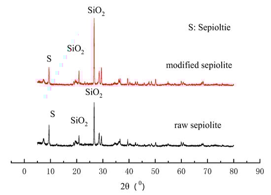 Figure 2 shows the X-ray diffraction analysis spectra of sepiolite before and after CTAB modification. When comparing the X-ray diffraction of modified sepiolite and raw sepiolite, the diffraction peak intensity of sepiolite and quartz sand was slightly reduced and no significant change in its characteristic peak position was observed. This indicates that although the surfactant CTAB modifies the sepiolite surface, it does not change the crystal structure of sepiolite. The functional modification of CTAB mainly occurrs on the surface of the raw sepiolite, thereby maintaining the original sepiolite structure. This is also in accordance with previous research [2,17].