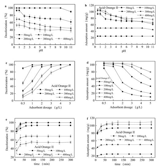 Effect of pH, adsorbent dosage and adsorption duration on the Acid Orange II adsorption performance. In (a,b), the adsorption test was conducted with 2 g/L modified sepiolite for 120 min under an oscillation rate of 180 r/min and 25 °C; in (c,d), the adsorption test was conducted for 120 min under initial pH value of 1, an oscillation rate of 180 r/min and 25 °C; in (e,f), the adsorption test was conducted with 2 g/L modified sepiolite under an oscillation rate of 180 r/min, an initial pH value of 1 and 25 °C.