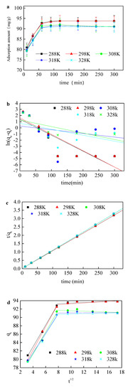 Figure 5a shows the variation of adsorption amount with temperature. Similarly to Figure 5f, the whole adsorption process was divided into two stages, namely the rapidly adsorption stage at 0–60 min and the plain stage after 60 min. The adsorption amount reached the maximum at 120 min. The adsorption reaches equilibrium irrespective of applied temperature. The adsorption amount declined from 93.78 to 90.95 mg with the increase in temperature from 288 to 328 K, indicating that the adsorption amount decreased with the rise in temperature and the whole adsorption process is in an exothermic state, although the temperature has a limited effect on the adsorption. When the temperature is over 298 K, the adsorption amount of the adsorbent on Acid Orange II decreased slightly after the equilibrium time, which indicates that the desorption happened at a high temperature. To investigate the adsorption kinetics, the quasi-first-order reaction kinetics model, quasi-second-order reaction kinetics model at various temperatures, and the intraparticle diffusion model were employed. The adsorption of Acid Orange II by organic sepiolite is consistent with the quasi-secondary reaction kinetics model rather than the quasi-first reaction kinetics model at different temperatures [33]. Table 2 shows that the correlation coefficients of the quasi-secondary reaction kinetics model were over 0.9999, and the correlation coefficients of quasi-first-order reaction kinetics were between 0.2726 and 0.7520. When the temperature raised from 288 to 328 K, the quasi-secondary reaction rate constant k2 was increased from 6.7 × 10−3 to 1.27 × 10−2. The migration speed of Acid Orange II accelerated, and the viscosity of the liquid decreased with the rise in temperature, which leads to the reduction in mass transfer resistance and the enhancement of adsorption rate. Adsorption kinetics are generally controlled by a variety of mechanisms, where the diffusion mechanism plays a decisive role. The initial curve segment mainly includes rapid external diffusion, boundary layer diffusion and surface diffusion; the plain segment is mainly a gentle adsorption segment. The adsorption site reduced, and the internal diffusion of the particle was alleviated in this stage.