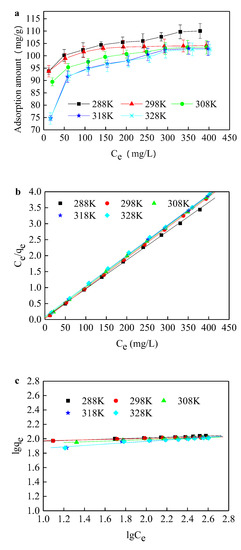 (a) Adsorption isotherm at various temperatures; (b) Langmuir linear fitting of experimental data at various temperatures; (c) Freundlich linear fitting of experimental data at various temperatures. To ensure the adsorbed saturation, the adsorption test was conducted with 200 mg/L Acid Orange II and 2 g/L modified sepiolite under an oscillation rate of 180 r/min and an initial pH value of 1 for at least 10 h at a certain temperature in a constant temperature oscillating box.