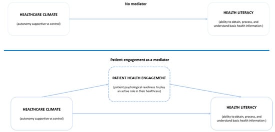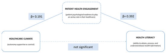 Among a diverse array of potential intervening variables in the relationship between healthcare climate and health literacy, this study found the mediating role of the Patient Health Engagement model (such as the measure of the patients’ psychological readiness to engage) in healthcare in this path. Our analysis demonstrated patient health engagement to be a critical construct. While an indirect pathway between autonomy-supportive climate and health literacy via Patient Health Engagement has been mentioned in the literature [,], empirical research has not reported on the subject. To our knowledge, the present study is the first to support the presence of an indirect relationship among those variables and to empirically demonstrate the role of patients’ psychological readiness to engage in this interaction. The study model suggests that the Patient Health Engagement model is crucial to the link between a healthcare climate oriented to support patient autonomy and health literacy. This means that the patient’s psychological readiness to play an active role during the healthcare encounters is a key factor in the influence of autonomy-supportive climate on the patients’ health literacy level.